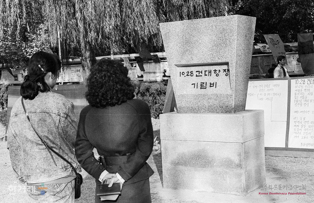 - 1988년 11월 2일 전두환 이순자 구속처벌을 위한 학생투쟁연합을 결성한 각 대학들이 체포결사대를 조직하는 가운데 서울 건국대에서 결성된 체포결사대 학생들이 집회를 갖고 있다. 한편 학생들이 지난 1987년 11월 경 경찰에 압수되어 상징물이 없는 건대항쟁 기림비를 쳐다보고 있다.