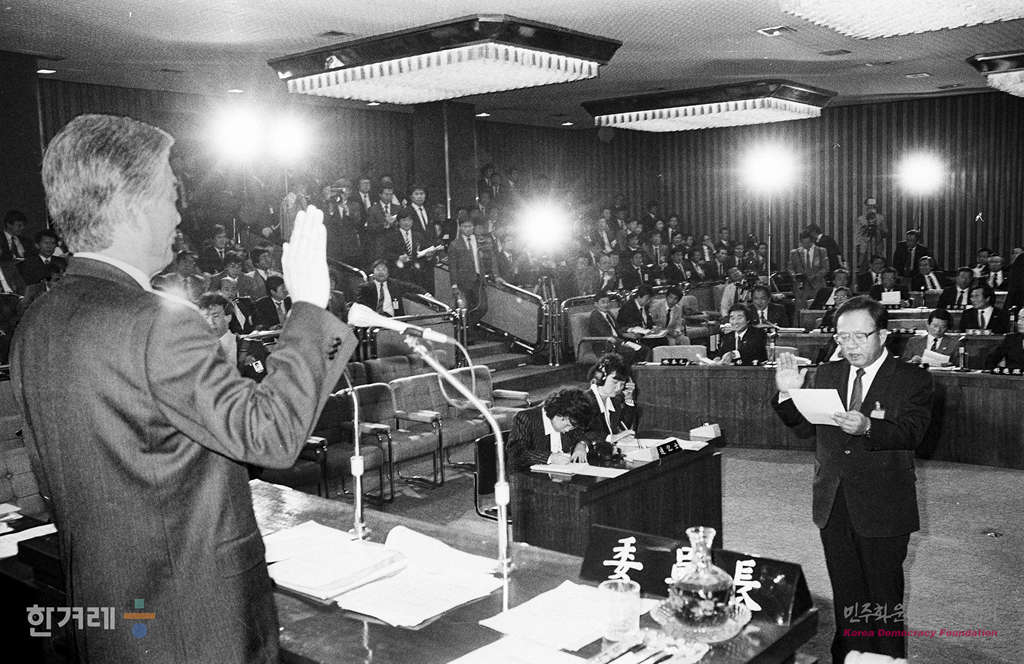 - 1988년 11월 3일 국회사상 처음으로 국회 일해재단 비리관련 청문회가 열려 각 증인에 대해 민정, 평민, 통일, 공화당이 한 사람씩의 대표신문을 한뒤 다른 의원들이 간단한 보충 질문을 하는 형식으로 진행하고 있다.
