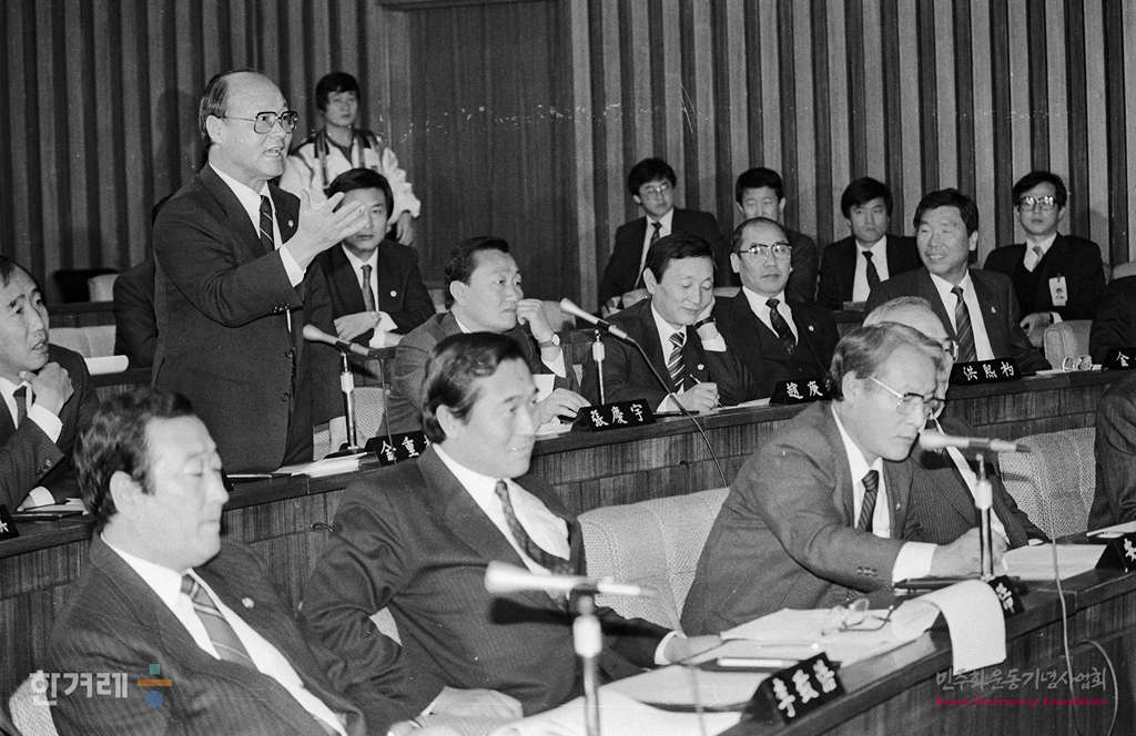 - 1988년 11월 3일 국회사상 처음으로 국회 일해재단 비리관련 청문회가 열려 각 증인에 대해 민정, 평민, 통일, 공화당이 한 사람씩의 대표신문을 한뒤 다른 의원들이 간단한 보충 질문을 하는 형식으로 진행하고 있다.