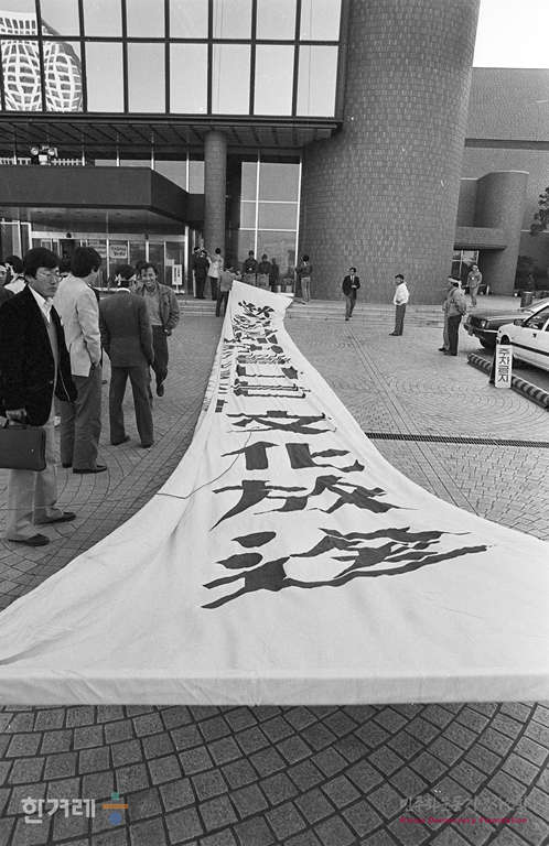 - 1988년 11월 3일 오전 10시 문화방송 최석채 회장과 김영수 사장 취임식이 예정된 가운데 문화방송 노조원들이 저지농성을 하고 있다. 이날 취임식은 무기한 연기가 되었다.