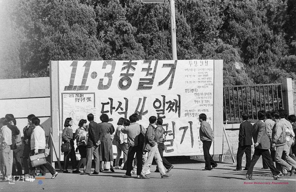 - 1988년 11월 3일 오후3시 전두환 이순자씨의 구속을 요구하며 ‘전.이 체포 구속의 날’로 선포한 가운데 서울 연세대학교 민주광장에서 대학생들이 출정식을 하고 있다.