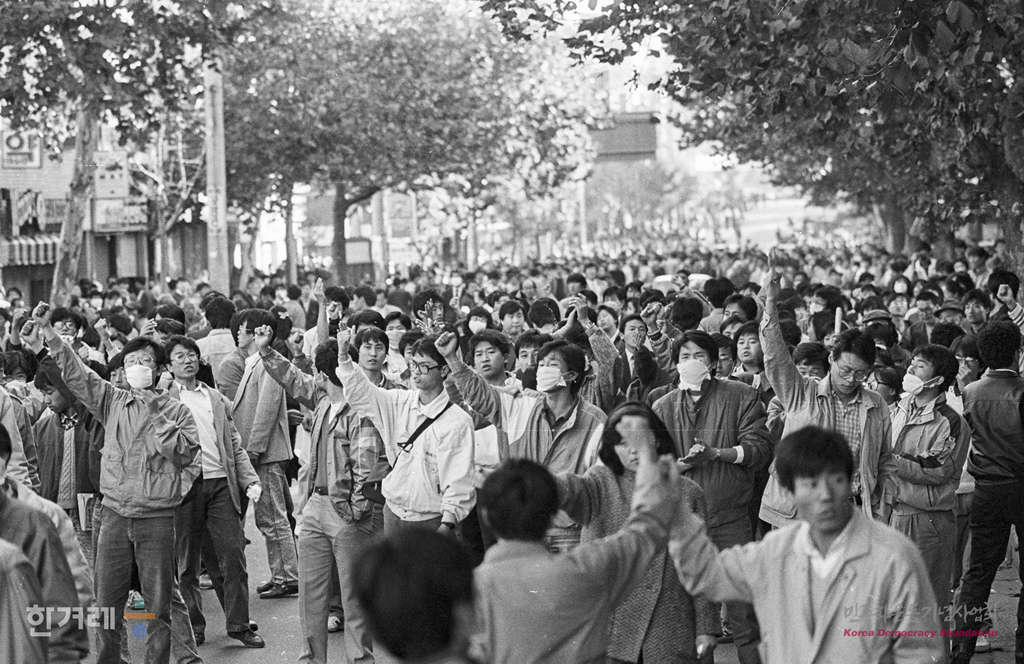 - 1988년 11월 3일 전두환 이순자씨 구속처벌을 요구하며 6월항쟁 이후 최대규모의 시위로 벌어진 가운데 서울 명동 롯데백화점앞 차도에서 학생들이 거리시위를 벌이고 있다.