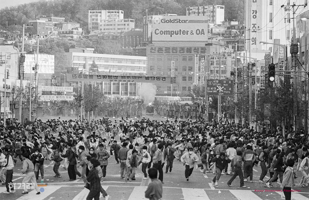 - 1988년 11월 3일 전두환 이순자씨 구속처벌을 요구하며 6월항쟁 이후 최대규모의 시위로 벌어진 가운데 서울 명동 롯데백화점앞 차도에서 학생들이 거리시위를 벌이고 있다.