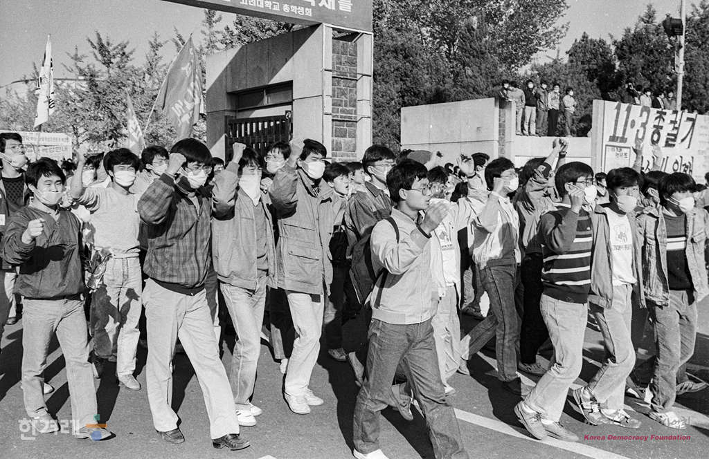 - 1988년 11월 3일 전두환 이순자씨 구속처벌을 요구하며 6월항쟁 이후 최대규모의 시위로 벌어진 가운데 서울 명동 롯데백화점앞 차도에서 학생들이 거리시위를 벌이고 있다.