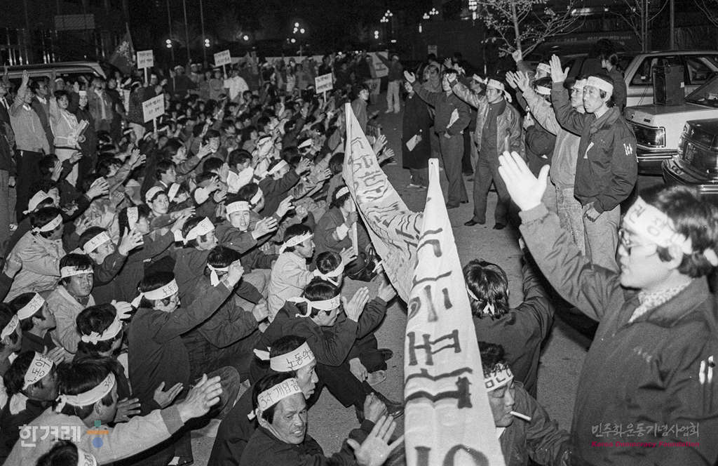 - 1988년 11월 4일 오후7시 서울지역 노조협의회 소속 노동자들이 서울 여의도 국회의사당앞에서 노동법개정 촉구 및 노조탄압 분쇄 결의대회를 하고 있다.