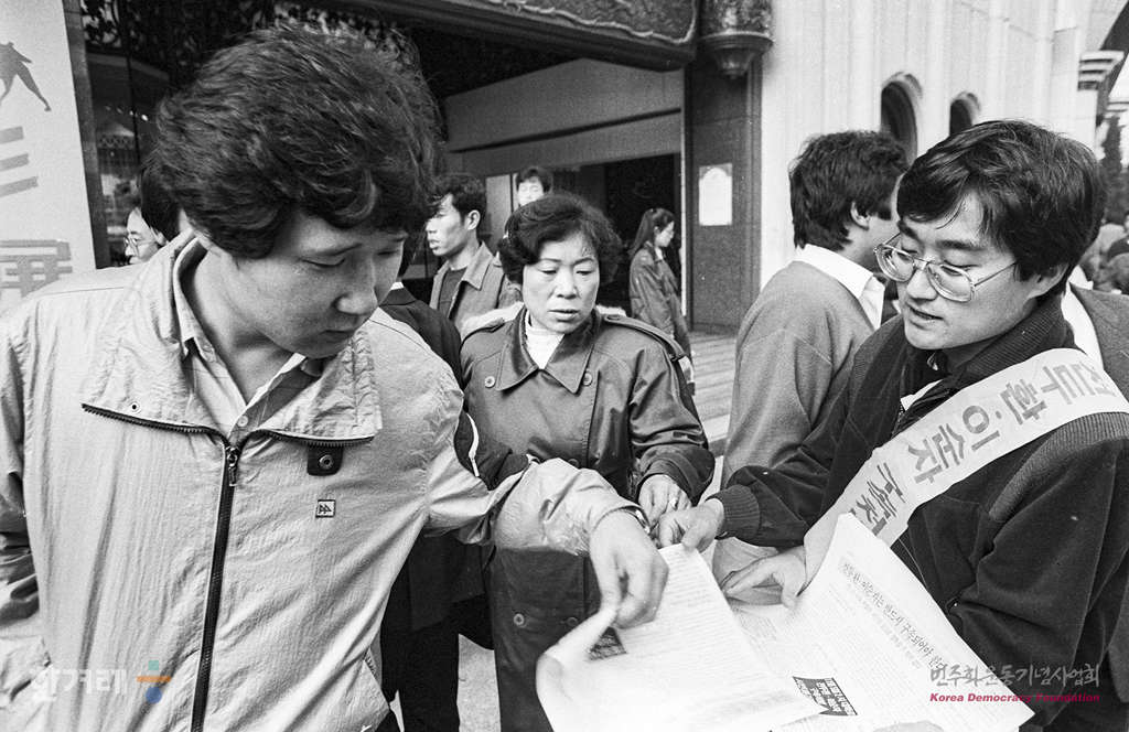 - 1988년 11월 4일 재야 15개 단체로 구성된 ‘광주학살.5공비리 주범 전두환 이순자 구속처벌을 위한 투쟁본부’ 회원들이 서울도심에서 범국민궐기대회를 알리는 홍보물을 시민들에게 나눠주고 있다.