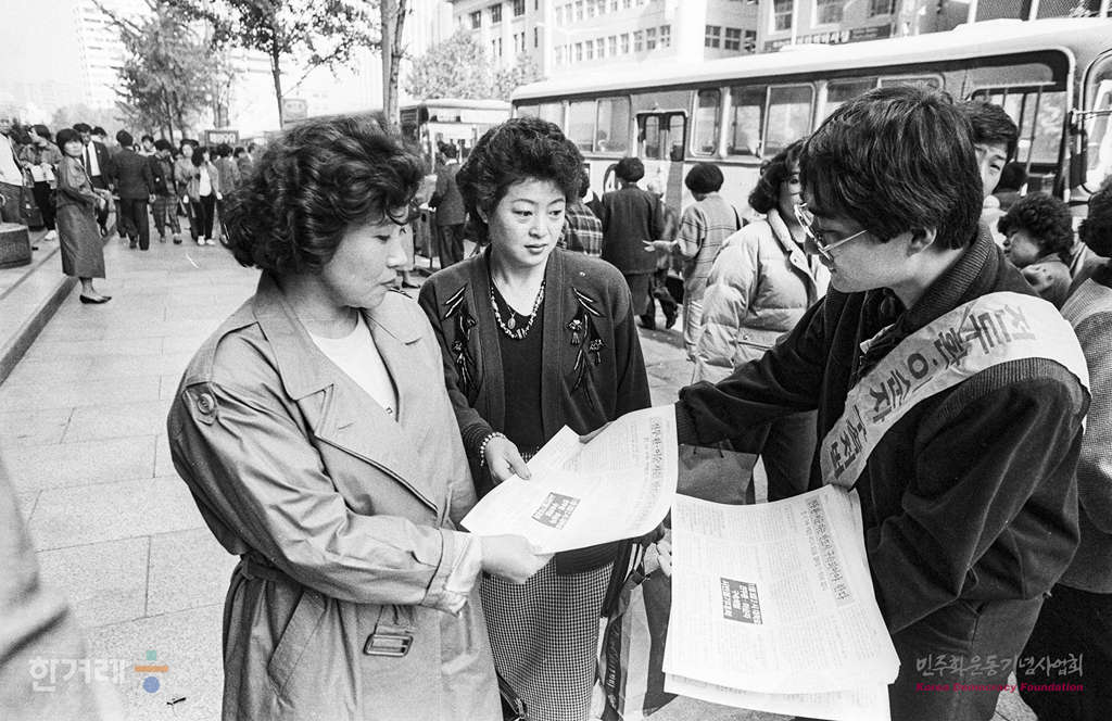 - 1988년 11월 4일 재야 15개 단체로 구성된 ‘광주학살.5공비리 주범 전두환 이순자 구속처벌을 위한 투쟁본부’ 회원들이 서울도심에서 범국민궐기대회를 알리는 홍보물을 시민들에게 나눠주고 있다.