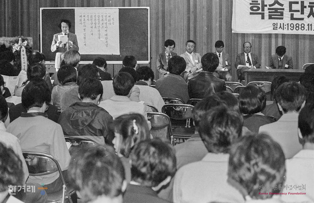 - 1988년 11월 5일 진보적 학술단체들의 모임인 학술단체협의회가 이화여대 경영관홀에서 학계원로 및 회원들이 참석한 가운데 창립대회를 하고 있다.