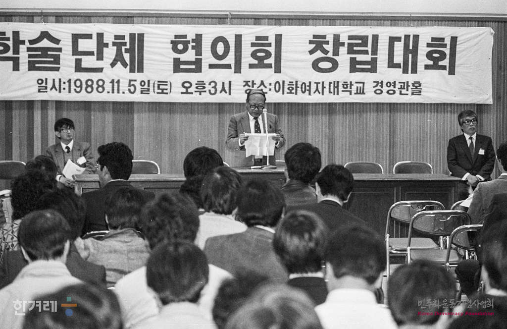 - 1988년 11월 5일 진보적 학술단체들의 모임인 학술단체협의회가 이화여대 경영관홀에서 학계원로 및 회원들이 참석한 가운데 창립대회를 하고 있다.