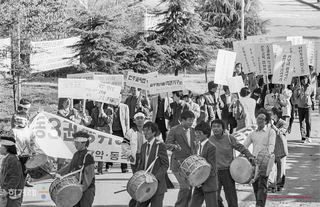 - 1988년 11월 5일 오후3시 교육관계법의 전면 개정을 추진하고 있는 서울교사협의회 소속 교사들이 서강대 소운동장에서 ‘민주교육법 쟁취 결의대회’를 하고 있다. 이날 여의도 국회의사당까지 평화대행진을 벌일 계획이었지만 경찰의 저지로 무산됐다.