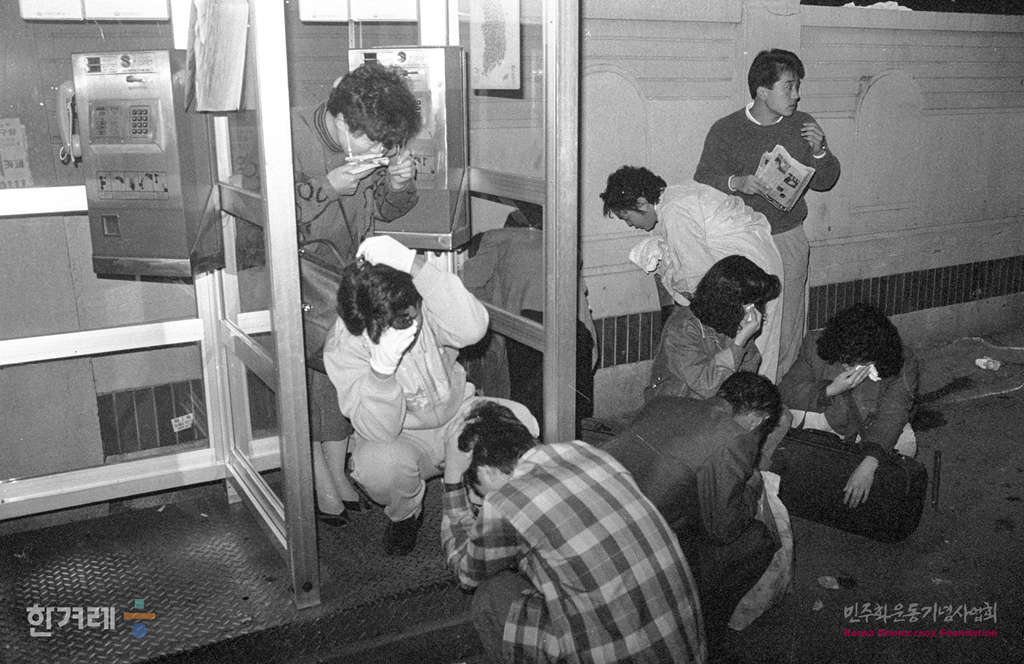 - 1988년 11월 5일 전두환 이순자씨의 구속 처벌을 요구하는 재야단체들의 시민궐기대회를 마친 뒤 서울도심 시위가 벌어지자 경찰들이 시위대를 해산하기 위해 쏜 최류탄으로 인해 시민들이 고통을 받고 있다.