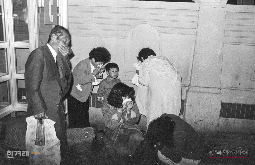 - 1988년 11월 5일 전두환 이순자씨의 구속 처벌을 요구하는 재야단체들의 시민궐기대회를 마친 뒤 서울도심 시위가 벌어지자 경찰들이 시위대를 해산하기 위해 쏜 최류탄으로 인해 시민들이 고통을 받고 있다.