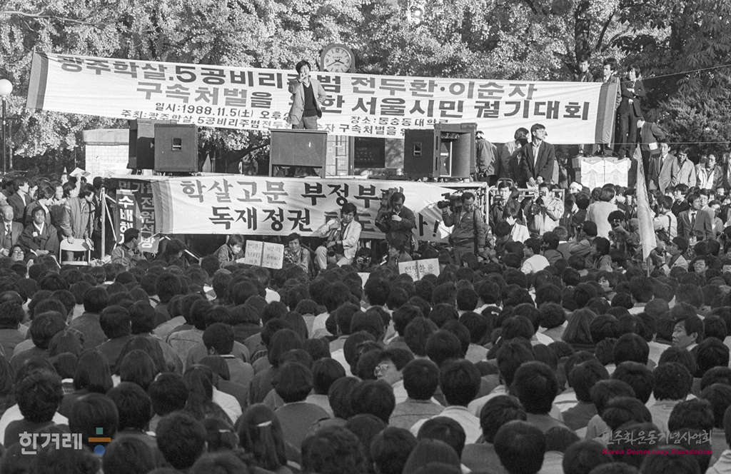 - 1988년 11월 5일 민통련을 비롯한 15개 재야단체로 구성된 광주학살 5공비리 주범 전두환 이순자 구속 처벌을 위한 투쟁본부 등 20개 사회단체 주최로 서울 대학로에서 열린 시민궐기대회를 마친 참가들이 거리행진을 하며 경찰과 충돌을 하고 있다.