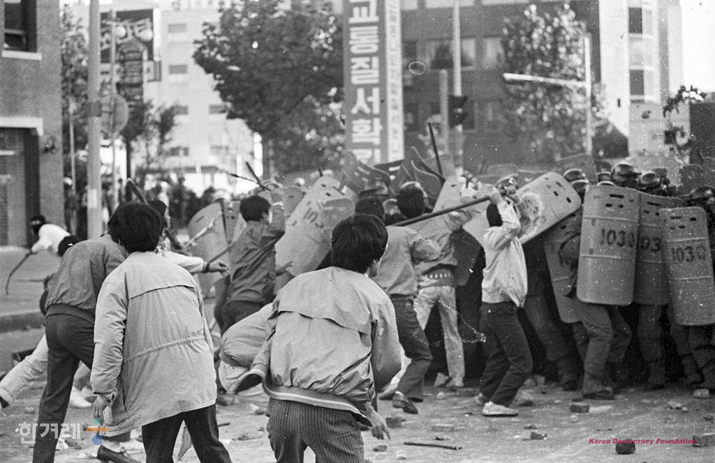 - 1988년 11월 5일 민통련을 비롯한 15개 재야단체로 구성된 광주학살 5공비리 주범 전두환 이순자 구속 처벌을 위한 투쟁본부 등 20개 사회단체 주최로 서울 대학로에서 열린 시민궐기대회를 마친 참가들이 거리행진을 하며 경찰과 충돌을 하고 있다.