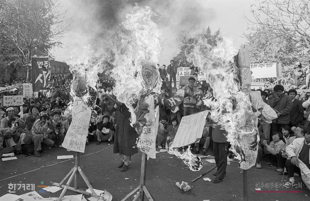 - 1988년 11월 5일 민통련을 비롯한 15개 재야단체로 구성된 광주학살 5공비리 주범 전두환 이순자 구속 처벌을 위한 투쟁본부 등 20개 사회단체 주최로 서울 대학로에서 열린 시민궐기대회를 마친 참가들이 거리행진을 하며 경찰과 충돌을 하고 있다.