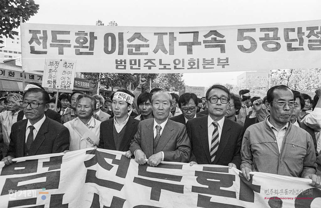 - 1988년 11월 5일 민통련을 비롯한 15개 재야단체로 구성된 광주학살 5공비리 주범 전두환 이순자 구속 처벌을 위한 투쟁본부 등 20개 사회단체 주최로 서울 대학로에서 열린 시민궐기대회를 마친 참가들이 거리행진을 하며 경찰과 충돌을 하고 있다.