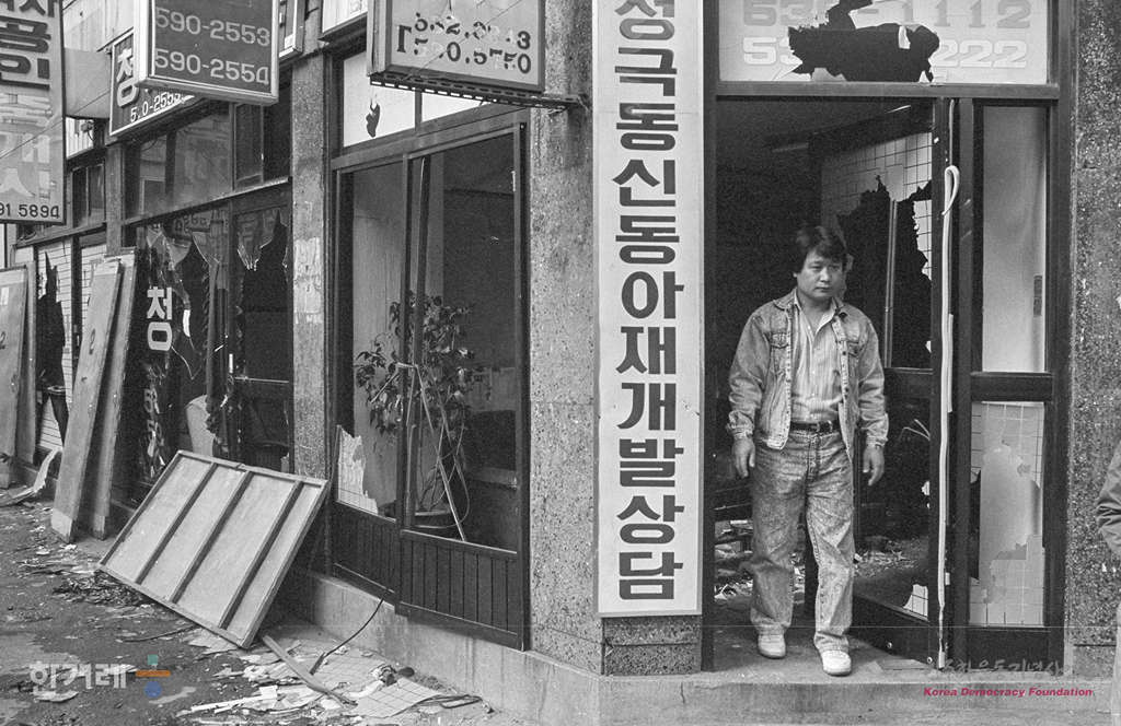 - 1988년 11월 5일 서울 동작구 사당2동 재개발지구에서 재개발 시공업체인 우성건설 등 3개 건설업체가 고용한 철거반원과 세입자가 충돌하며 양측 부상자가 속출한 가운데 화난 주민들이 파괴한 재개발 사무실을 들러보고 있다.