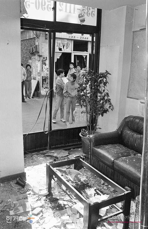 - 1988년 11월 5일 서울 동작구 사당2동 재개발지구에서 재개발 시공업체인 우성건설 등 3개 건설업체가 고용한 철거반원과 세입자가 충돌하며 양측 부상자가 속출한 가운데 화난 주민들이 파괴한 재개발 사무실을 들러보고 있다.