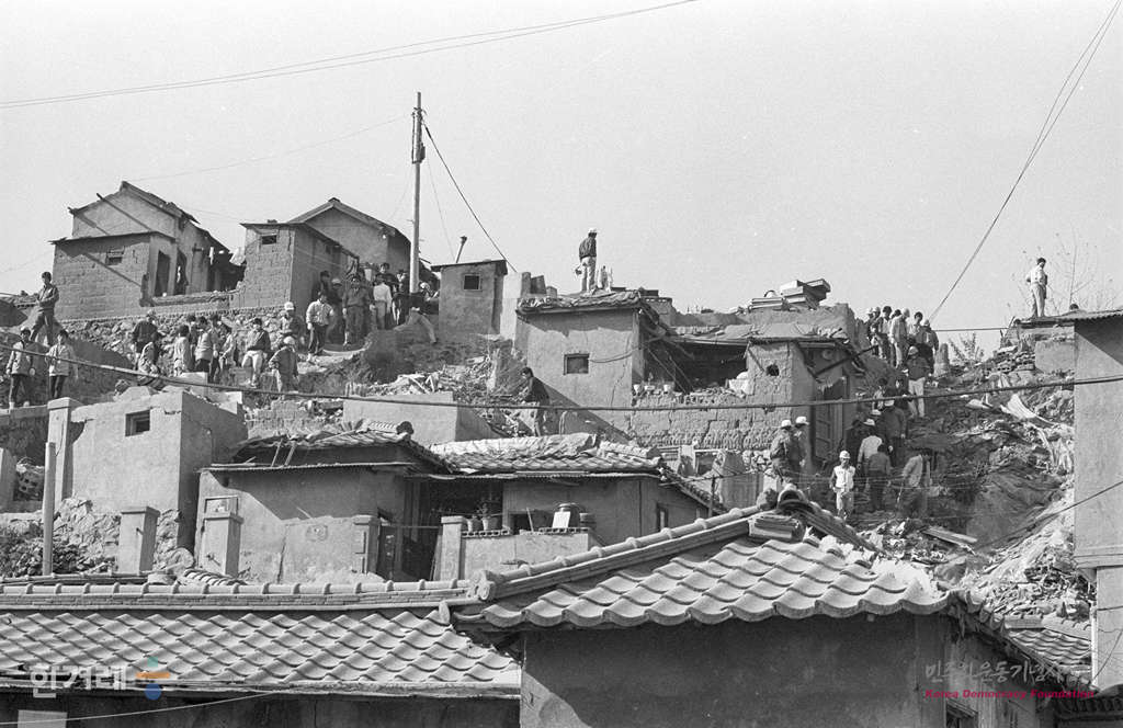 - 1988년 11월 6일 철거반원과 세입자들 사이의 충돌이 계속되는 있는 서울 동작구 사당2동 재개발지구에서 재개발조합쪽이 고용한 철거반원 8백여명이 철거를 강행하고 있다.