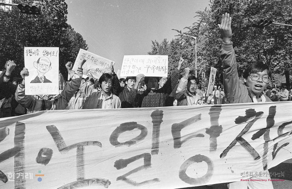 - 1988년 11월 5일 민통련을 비롯한 15개 재야단체로 구성된 광주학살 5공비리 주범 전두환 이순자 구속 처벌을 위한 투쟁본부 등 20개 사회단체 주최로 서울 대학로에서 열린 시민궐기대회는 지난해 대통령 선거 이후 최대 인파인 1만5천여 명의 시민 학생들이 참가했다.