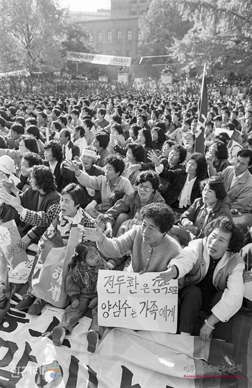 - 1988년 11월 5일 민통련을 비롯한 15개 재야단체로 구성된 광주학살 5공비리 주범 전두환 이순자 구속 처벌을 위한 투쟁본부 등 20개 사회단체 주최로 서울 대학로에서 열린 시민궐기대회는 지난해 대통령 선거 이후 최대 인파인 1만5천여 명의 시민 학생들이 참가했다.