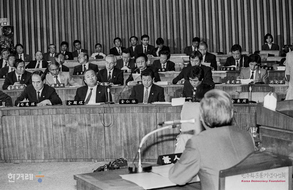 - 1988년 11월 7일 국회 제5공화국 비리조사 특위( 위원장 이기택 )는 일해재단 비리조사를 위한 2차 청문회를 열고 장세동( 전 청와대 경호실장, 안기부장)씨에 대한 증인신문을 하고 있다.
