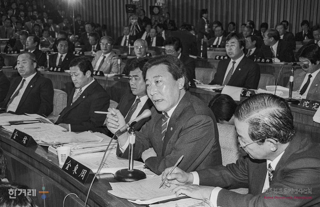 - 1988년 11월 7일 국회 제5공화국 비리조사 특위( 위원장 이기택 )는 일해재단 비리조사를 위한 2차 청문회를 열고 장세동( 전 청와대 경호실장, 안기부장)씨에 대한 증인신문을 하고 있다.