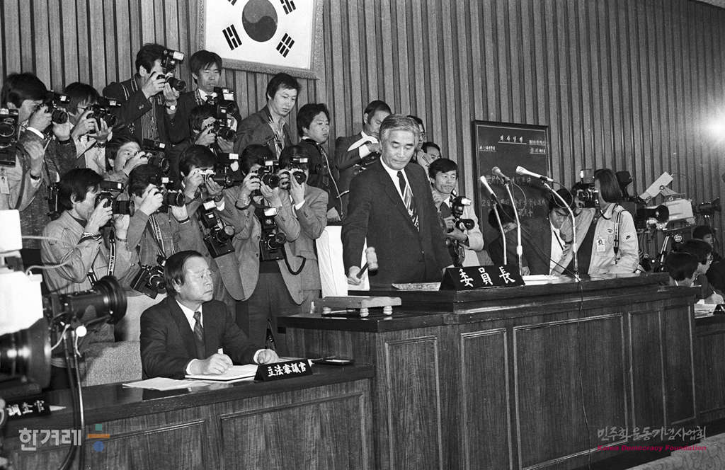 - 1988년 11월 7일 국회 제5공화국 비리조사 특위( 위원장 이기택 )는 일해재단 비리조사를 위한 2차 청문회를 열고 장세동( 전 청와대 경호실장, 안기부장)씨에 대한 증인신문을 하고 있다.