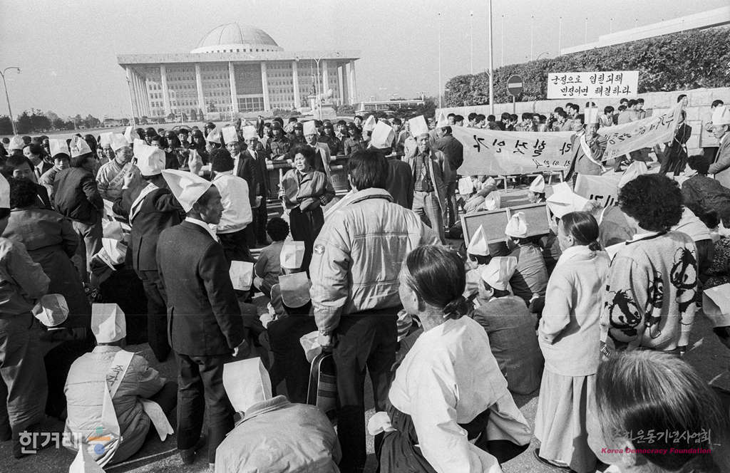 - 1988년 11월 7일 낮 12시40분께 서울 여의도 국회의사당앞에서 거창양민학살사건 유족 2백여명은 학살 희생자와 유족의 명예회복을 요구하며 농성을 벌이고 있다.