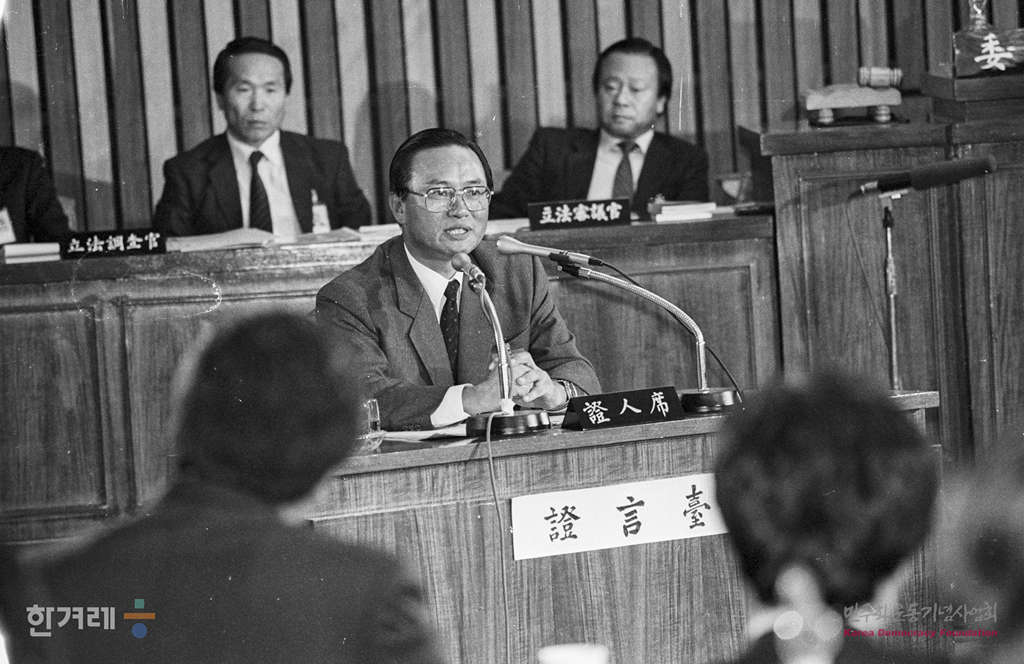 - 1988년 11월 8일 국회 5공비리조사 특위는 일해재단 비리관련 2차 청문회 이틀째를 속개하면서 안현태 ( 전 청와대 경호실장 )씨를 증인으로 출석시켜 신문을 하고 있다.