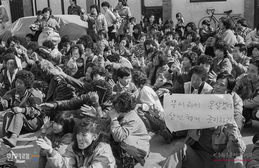 - 1988년 11월 8일 지난 7일 철거반들의 폭행으로 50여명의 부상자를 낸 서울 동작구 사동2동 재개발지구 세입자들이 평민당 동작을구 박실의원 사무실 앞에서 철거깡패 처벌과 임대주택 보장을 요구하며 농성을 벌이고 있다.