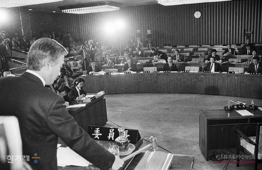 - 1988년 11월 9일 일해재단 2차청문회 마지막날이면서 사흘째인 국회 5공특위 일해재단청문회에서 회의를 속개하며 이기택 위원장이 청문회를 알리는 의사봉을 두들기고 있다.