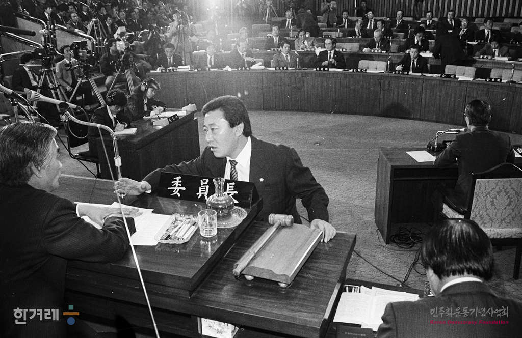 - 1988년 11월 9일 일해재단 2차청문회 마지막날이면서 사흘째인 국회 5공특위 일해재단청문회에서 회의를 속개하며 야당의원들이 회의에 앞서 자료들을 보며 얘기를 나누고 있다.