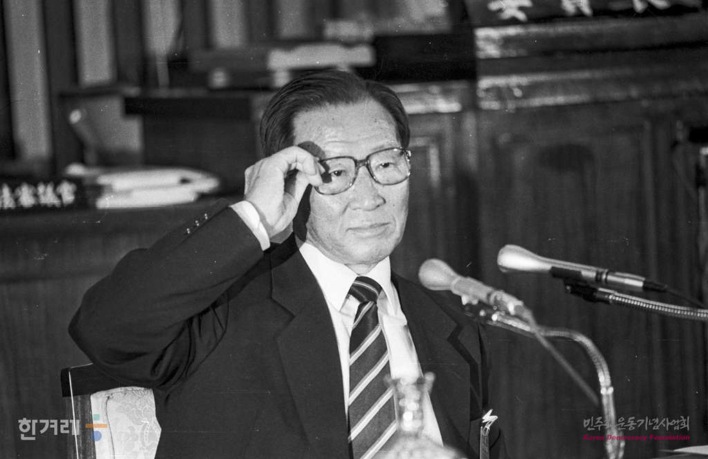 - 1988년 11월 9일 일해재단 2차청문회 마지막날이면서 사흘째인 국회 5공특위 일해재단청문회에서 회의를 속개하며 증인으로 출석한 정주영 현대그룹 명예회장이 의원들의 질의에 증언을 하고 있다.