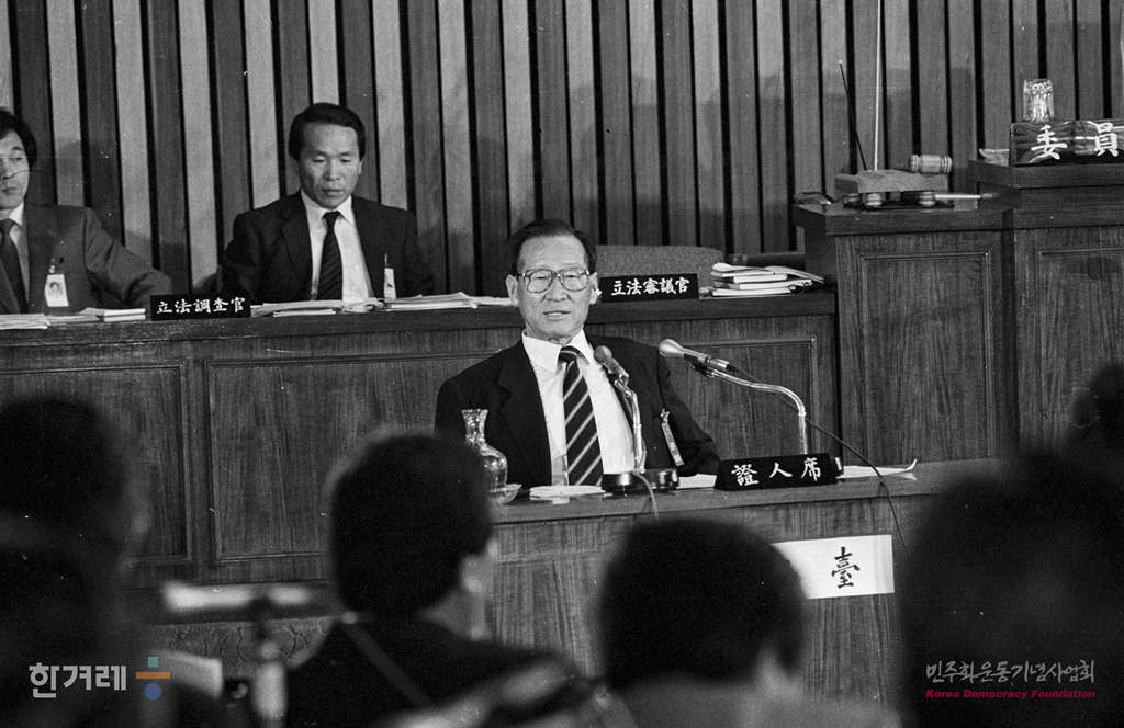 - 1988년 11월 9일 일해재단 2차청문회 마지막날이면서 사흘째인 국회 5공특위 일해재단청문회에서 회의를 속개하며 증인으로 출석한 정주영 현대그룹 명예회장이 의원들의 질의에 증언을 하고 있다.