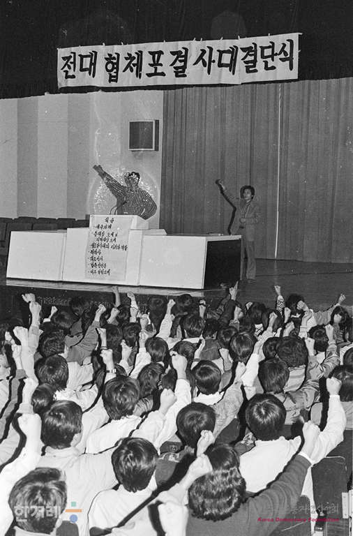 - 1988년 11월 9일 오후 2시10분 연세대에서 전대협소속 대학생들이 체포결사대 결단식을 갖고 있다.