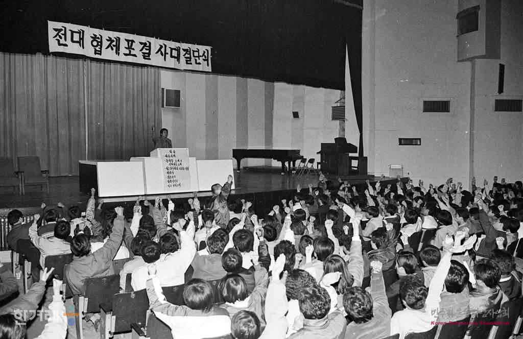- 1988년 11월 9일 오후 2시10분 연세대에서 전대협소속 대학생들이 체포결사대 결단식을 갖고 있다.