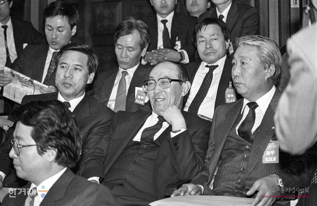 - 1988년 11월 9일 일해재단 2차청문회 마지막날이면서 사흘째인 국회 5공특위 일해재단청문회에서 회의를 속개하며 증인으로 출석한 양정모 국제그룹 회장이 장세동 전 청와대 비서실장이자 안기부장이 의원들의 답변하는 모습을 보며 웃음을 짓고 있다.