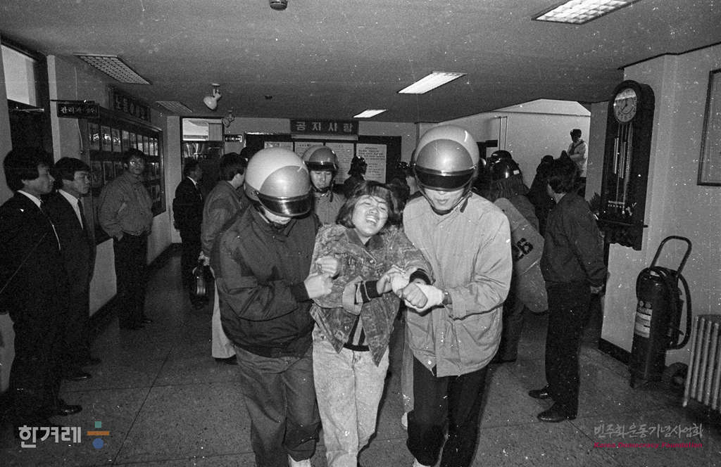 - 1988년 11월 10일 노조를 탄압하는 사장의 처벌을 요구하며 노동부 관악지방사무소에서 이틀째 농성중인 신애전자 노조원들이 경찰에 의해 강제 해산되고 있다.