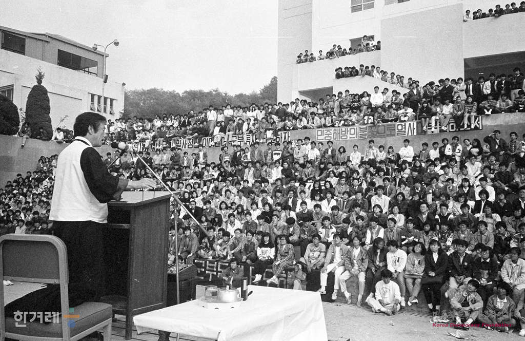 - 1988년 11월 11일 서울대 학생회관 앞에서 대학생들이 전태일 노동해방 열사 추모 및 분신투쟁 계승 결의대회를 하고 있다. 이날 행사에는 백기완 통일문제연구소 소장이 연설을 했다.