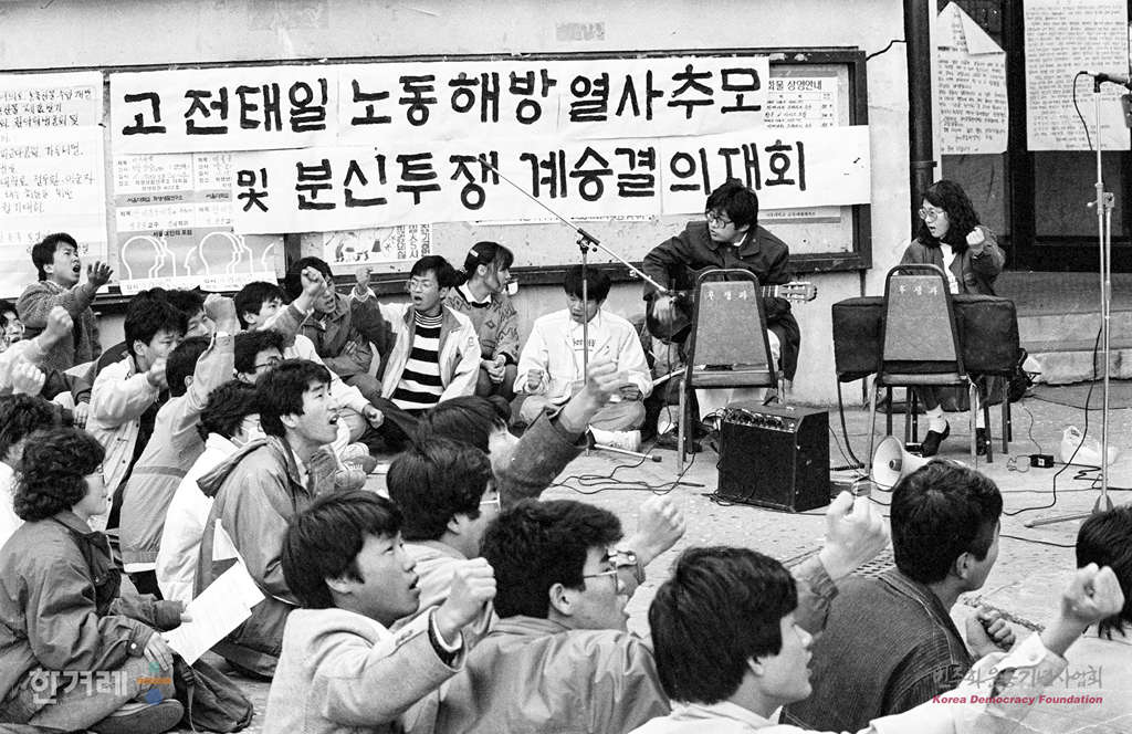 - 1988년 11월 11일 서울대 학생회관 앞에서 대학생들이 전태일 노동해방 열사 추모 및 분신투쟁 계승 결의대회를 하고 있다. 이날 행사에는 백기완 통일문제연구소 소장이 연설을 했다.