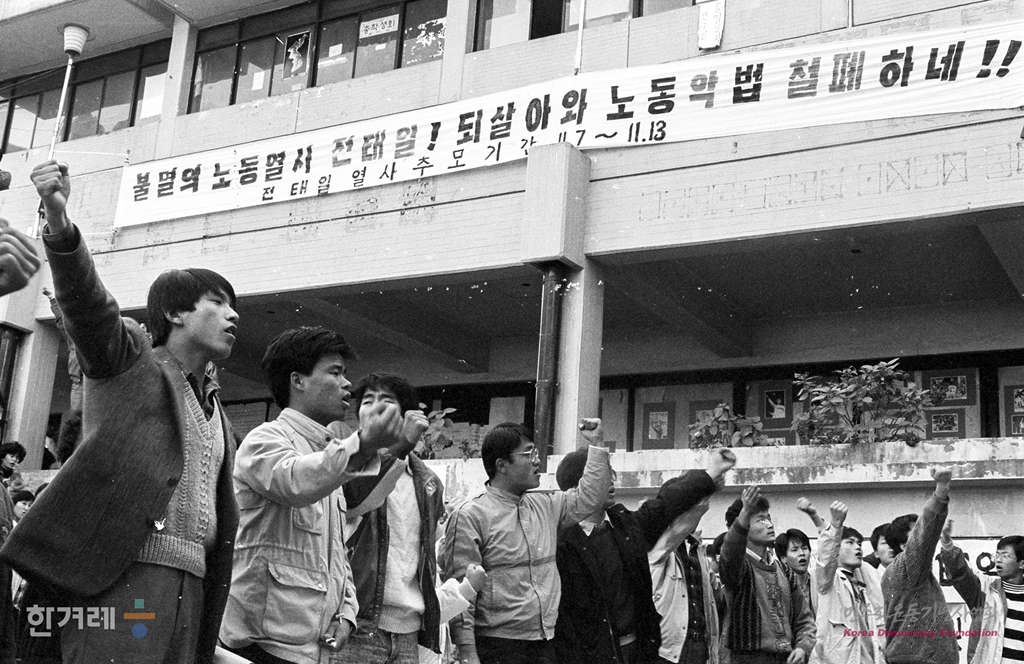 - 1988년 11월 11일 서울대 학생회관 앞에서 대학생들이 전태일 노동해방 열사 추모 및 분신투쟁 계승 결의대회를 하고 있다. 이날 행사에는 백기완 통일문제연구소 소장이 연설을 했다.