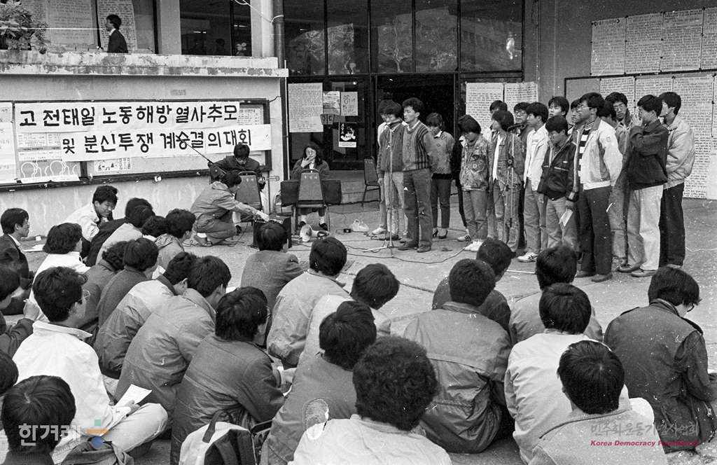 - 1988년 11월 11일 서울대 학생회관 앞에서 대학생들이 전태일 노동해방 열사 추모 및 분신투쟁 계승 결의대회를 하고 있다. 이날 행사에는 백기완 통일문제연구소 소장이 연설을 했다.