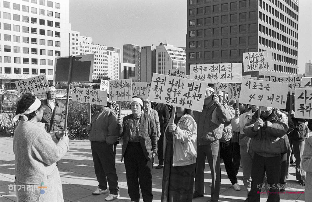 - 1988년 11월 11일 강서쇼핑 분양사기 피해자들이 서울 여의도에서 당국의 관심을 촉구하며 시위를 벌이고 있다.