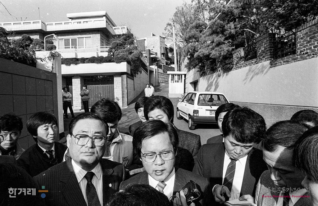 - 1988년 11월 12일 오전 국회 광주특위 의원들이 전두환씨의 청문회 출석을 요구하러 서울 연희동 집을 방문하는 모습을 취재하려하자 주변 경호를 하던 경찰들이 기자들의 취재를 막고 있다.