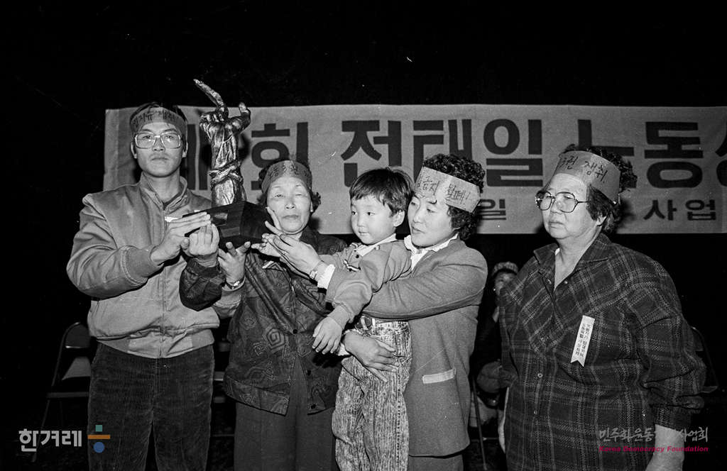 - 1988년 11월 12일 전태일 열사 기일을 즈음해 전태일기념사업회가 '전태일 정신'을 실현해 온 단체 또는 개인에게 수여하는 전태일노동상 시상식이 서울 연세대 강당에서 열려 첫 번째 수상자로 선정된 현대엔진 노조위원장 권용목씨를 대신해서 가족들이 상을 받고 있다.