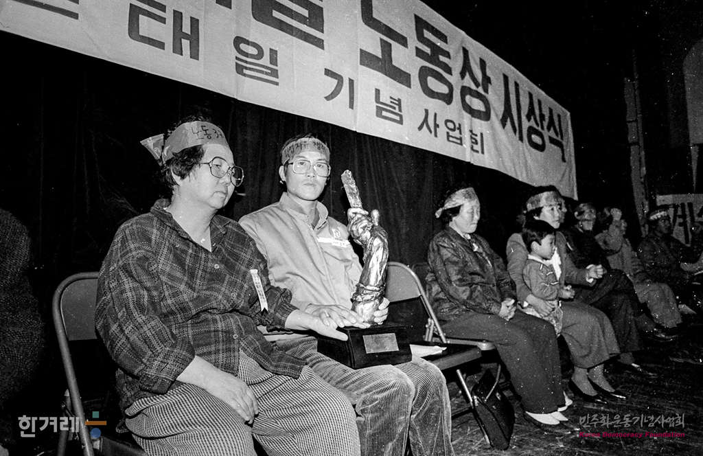 - 1988년 11월 12일 전태일 열사 기일을 즈음해 전태일기념사업회가 '전태일 정신'을 실현해 온 단체 또는 개인에게 수여하는 전태일노동상 시상식이 서울 연세대 강당에서 열려 첫 번째 수상자로 선정된 현대엔진 노조위원장 권용목씨를 대신해서 가족들이 상을 받고 있다.