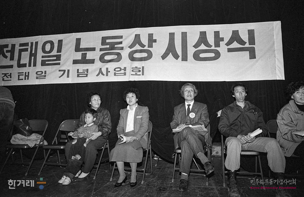 - 1988년 11월 12일 전태일 열사 기일을 즈음해 전태일기념사업회가 '전태일 정신'을 실현해 온 단체 또는 개인에게 수여하는 전태일노동상 시상식이 서울 연세대 강당에서 열려 첫 번째 수상자로 선정된 현대엔진 노조위원장 권용목씨를 대신해서 가족들이 상을 받고 있다.