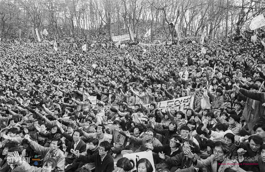 - 1988년 11월 13일 전국의 노동자 시민 학생 등 3만5천여명이 모인 서울 연세대 노천극장에서 ‘전태일 열사 정신 계승 노동악법개정 전국노동자대회’를 갖고 전태일 정신 계승하여 노동3권 쟁취하자‘고 외치고 있다.