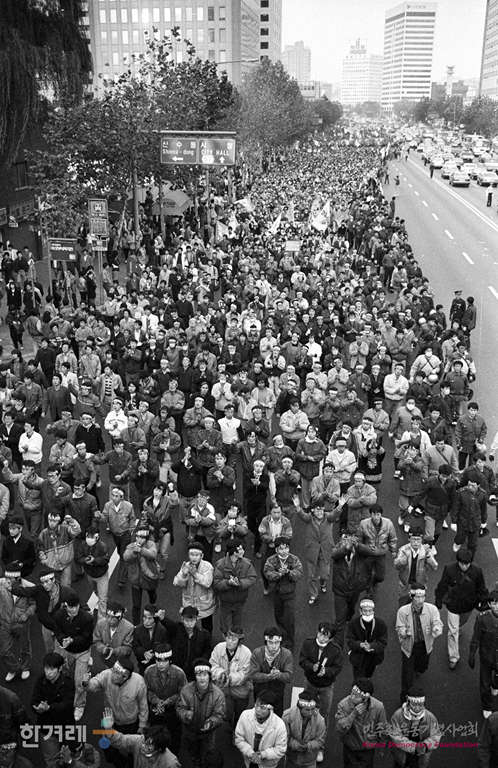 - 1988년 11월 13일 전국의 노동자 시민 학생 등 3만5천여명이 모인 서울 연세대 노천극장에서 ‘전태일 열사 정신 계승 노동악법개정 전국노동자대회’를 마치고 참석자 여의도 국회의사당 앞까지 평화행진을 하고 있다.